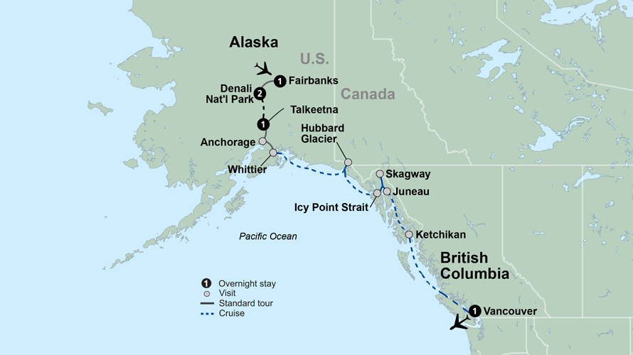 Traverse the Pacific coast by land and sea aboard one of Holland America Cruise Lines’ lovely ships on a breathtaking journey that takes you from Alaska to Vancouver, British Columbia. This is Alaska as you always imagined.