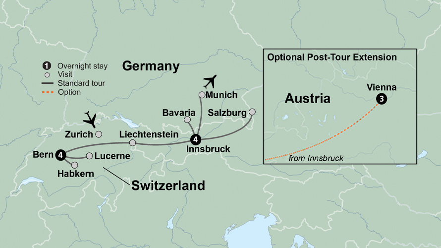Journey through spectacular mountain scenery and picturesque cities as you experience three Alpine countries. The hills are alive on this enchanting journey across Switzerland, Austria and Bavaria.